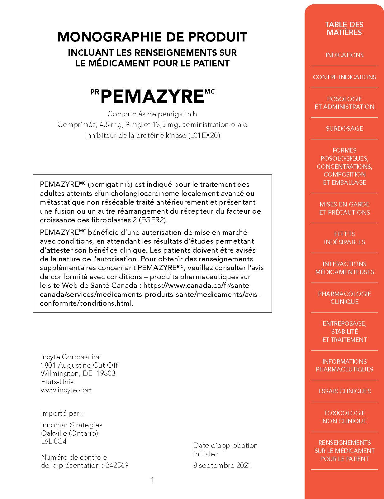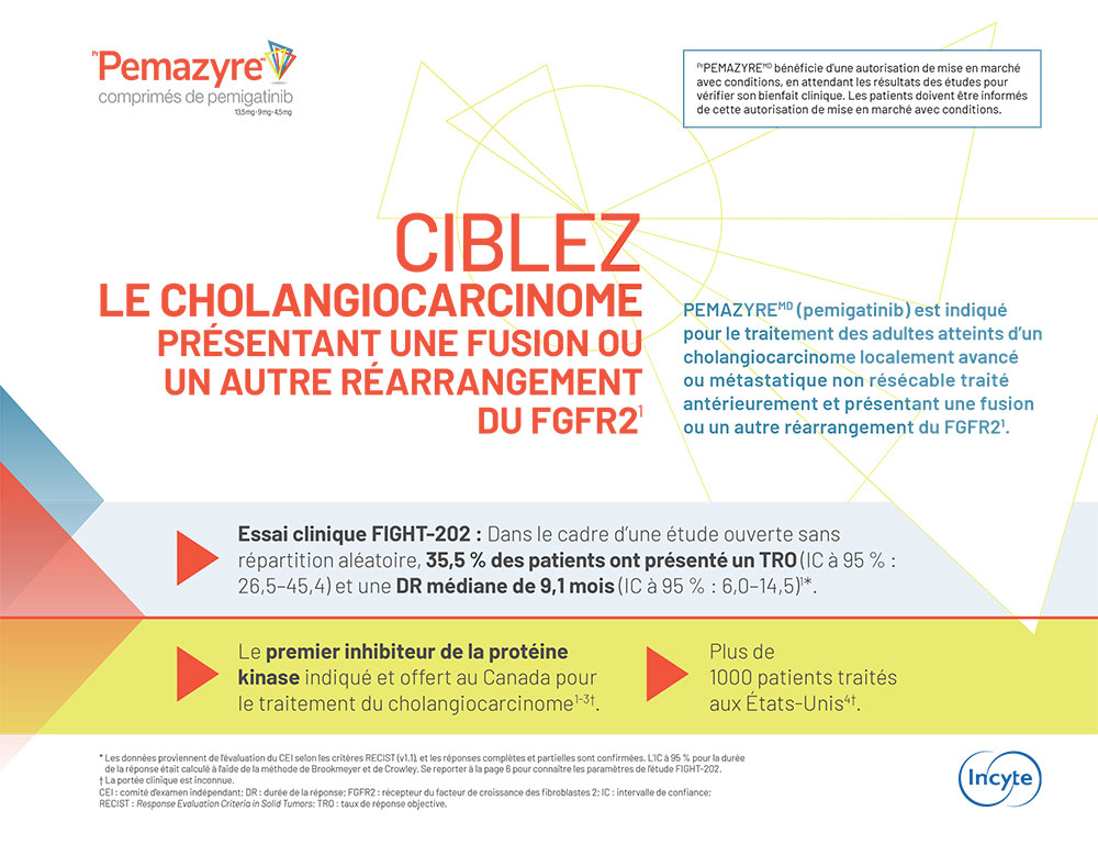 Référence : 1. Monographie de PEMAZYREMD. Incyte Corporation. 8 septembre 2021.