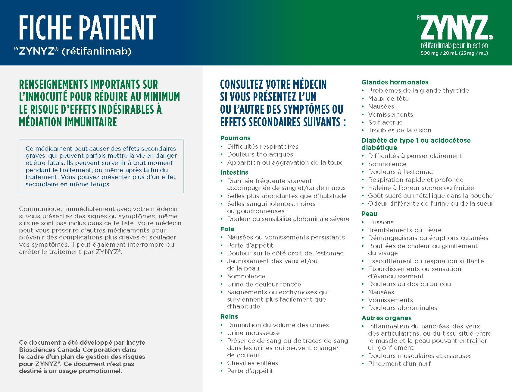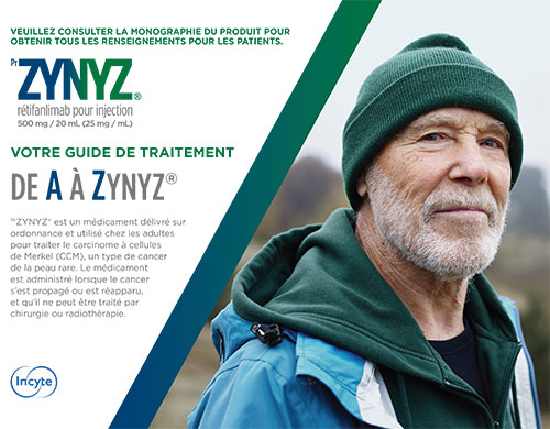 Veuillez consulter la monographie de produit ici pour obtenir des renseignements importants sur la surveillance et les épreuves de laboratoire, les effets indésirables, les interactions médicamenteuses et la posologie, qui ne sont pas abordés dans le présent document. Vous pouvez également vous procurer la monographie de produit par téléphone, au 1-833-309-2759, ou par courriel, à l’adresse medinfocanada@incyte.com.
